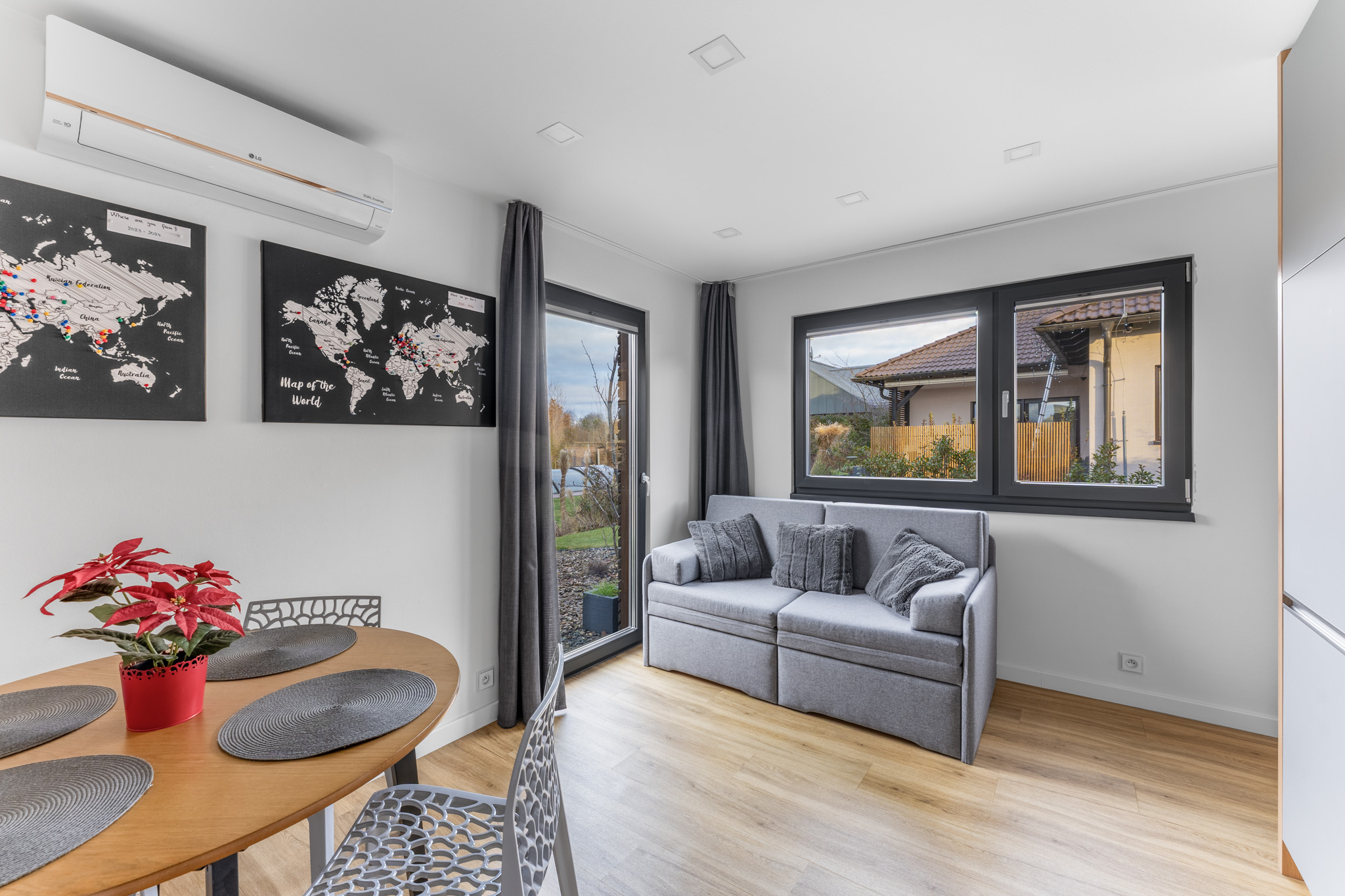 Tiny house je navržen jako multifunkční prostor. Je ideální pro domácí kancelář, kreativní ateliér, komfortní prostor pro hosty nebo relaxační útočiště po náročném dni.