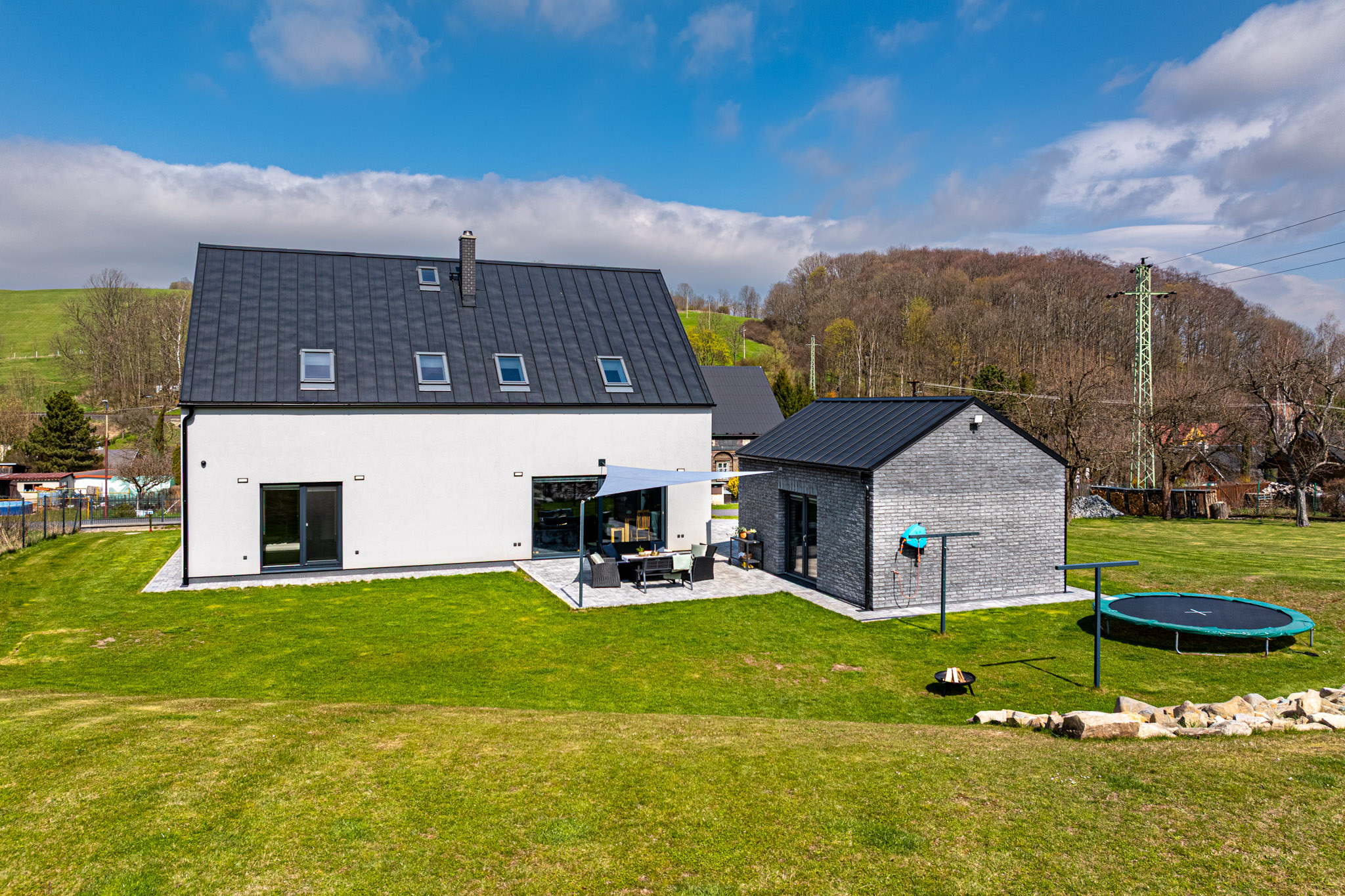 Pohodovou atmosféru tohoto domu vytváří nejen krásný výhled, ale také jeho orientace, světlost a fakt, že dům byl postaven člověkem, který do něj investoval vlastni úsilí, čas, energii a v některých ohledech i více, než by bylo potřeba. Každý detail tohoto domu nese otisk pečlivé práce majitele, který ho budoval s myšlenkou na domov pro svou rodinu. I díky tomu dům působí tak osobitě a nabízí poctivé zpracování i promyšlené řešení.