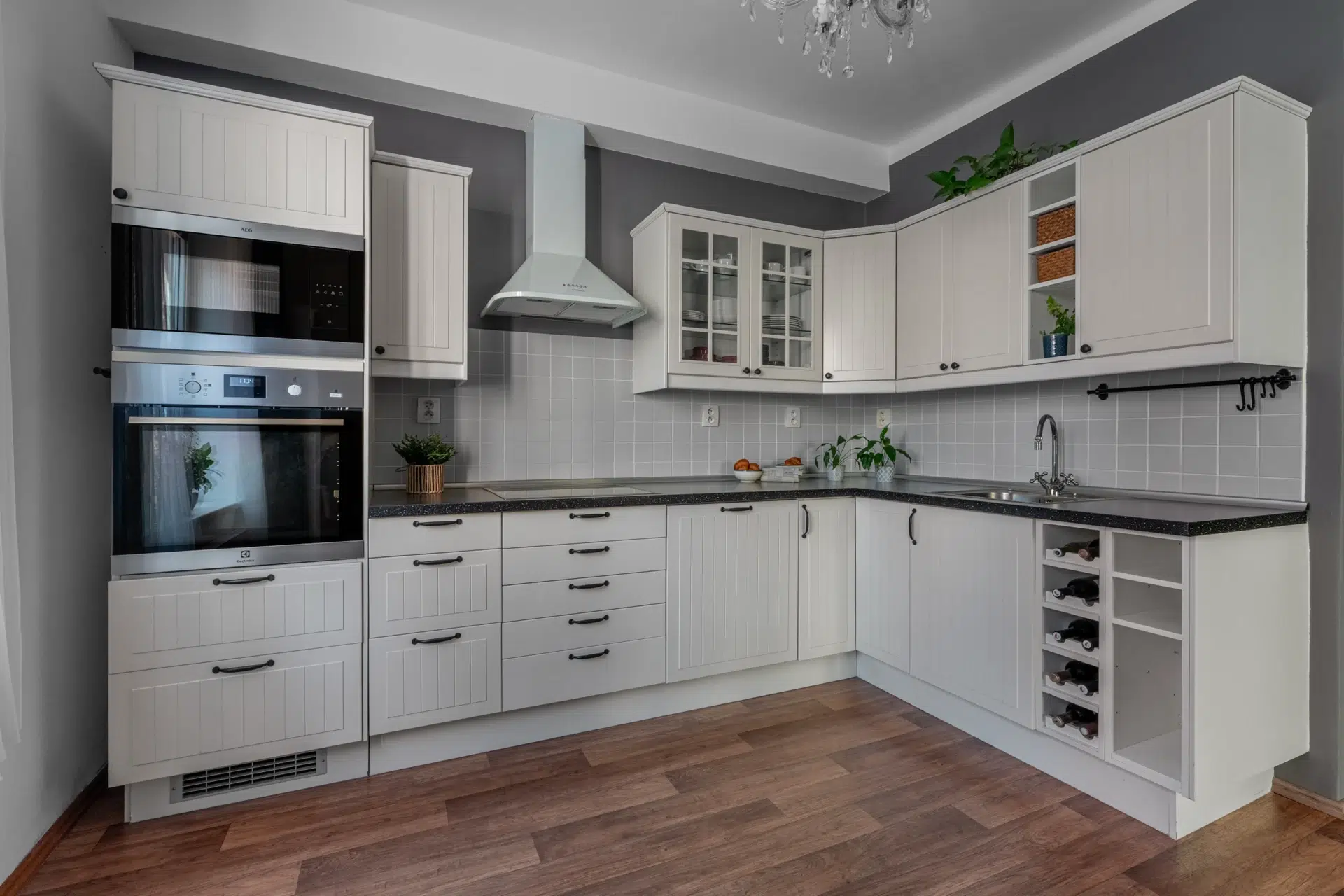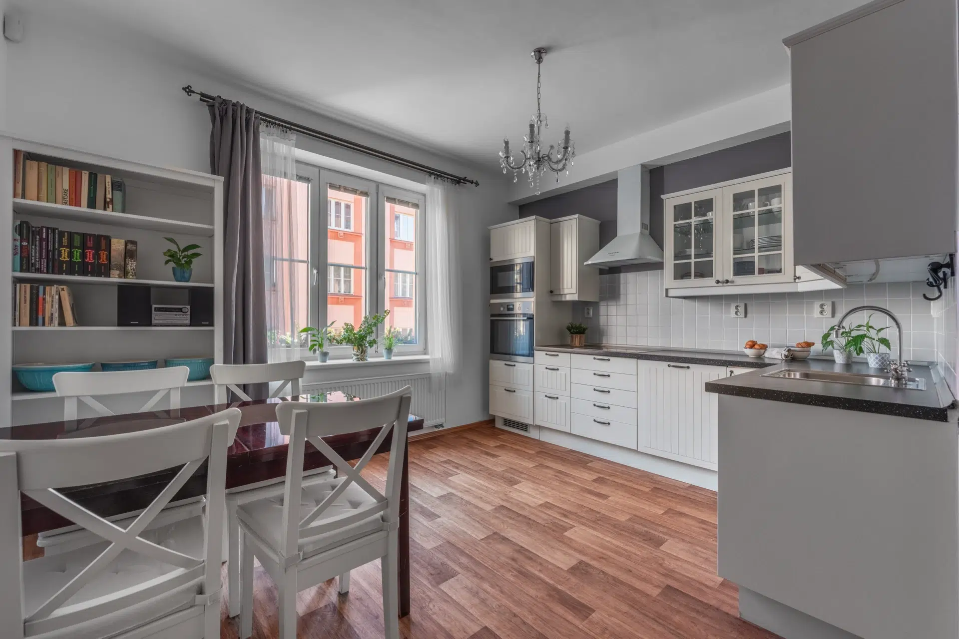 Rohová dispozice bytu, prostorná kuchyně s oknem, rekonstrukce 2012.