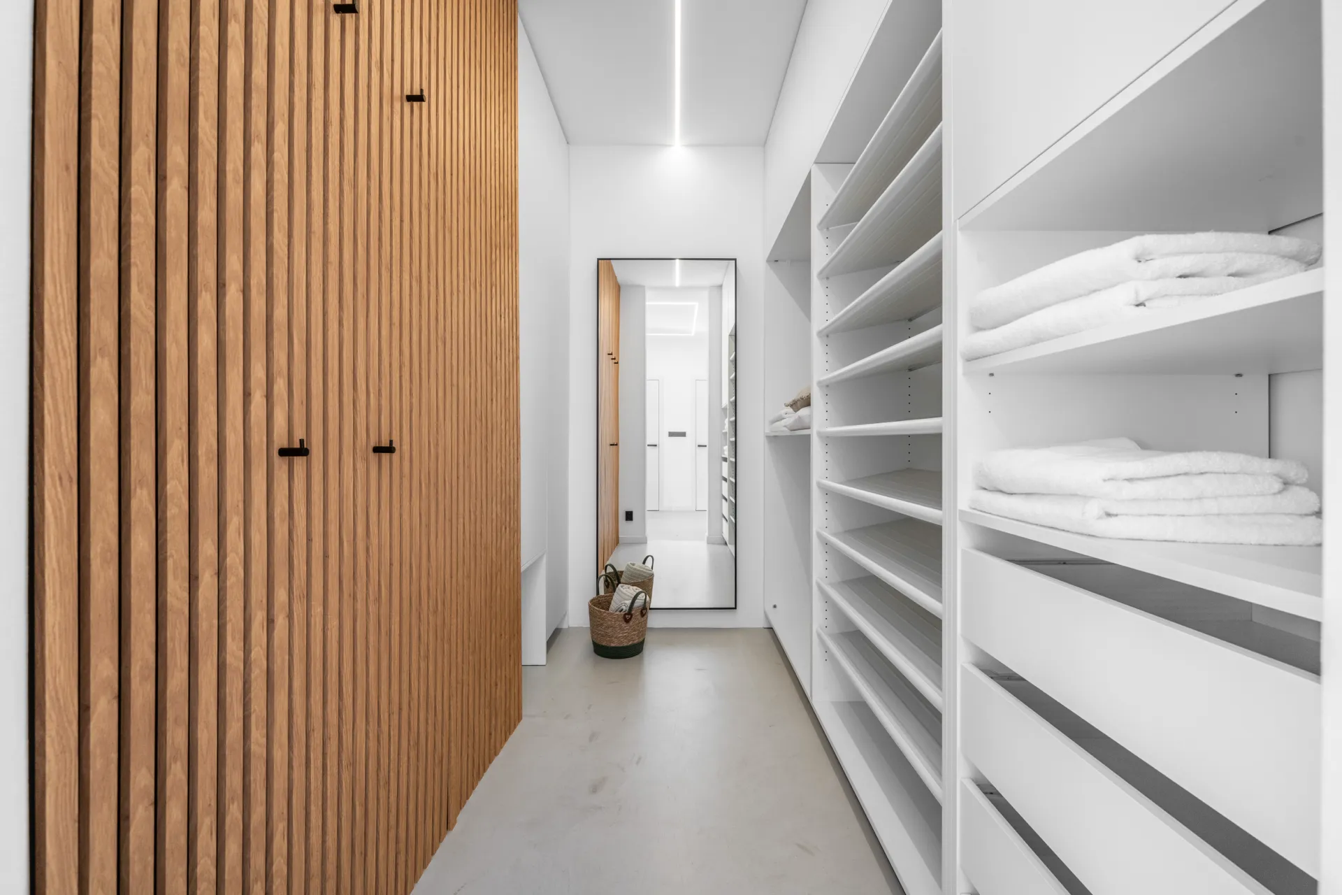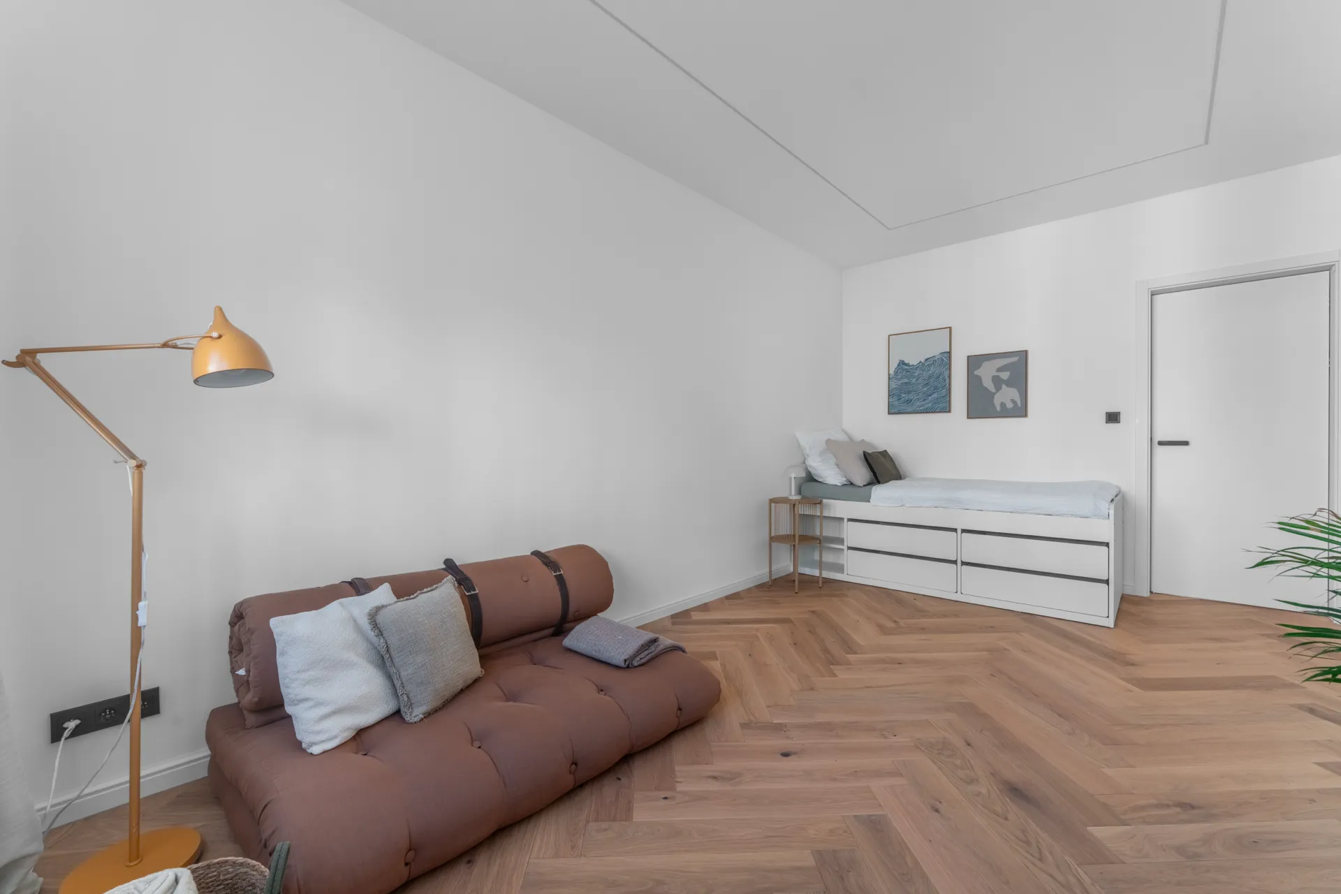 Minimalistická a světlá ložnice nabízí nejen dostatek prostoru pro volný pohyb, ale i velké úložné prostory, které poskytují praktické uspořádání. Světlost a příjemná atmosféra jsou podpořeny orientací oken, zatímco klimatizace přidává na komfortu. Součástí ložnice je také vlastní koupelna s toaletou, která poskytuje maximální soukromí a pohodlí. Ve večerních hodinách oceníte decentní designové osvětlení.